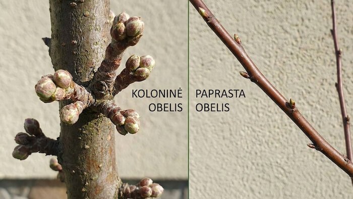 Tai yra pats svarbiausias momentas renkantis sodinuką, nes daugelis nesąžiningų pardavėjų paprastas obelis, įskiepytas į žemaūgius poskiepius, parduoda kaip kolonines. Tikrosios koloninės obelys turi specifinį geną (dažniausiai kilusį iš 'McIntosh Wijcik' mutacijos), kuris lemia, kad medis natūraliai beveik neišleidžia ilgų šoninių šakų. Vietoj jų ant pagrindinio liemens formuojasi daugybė trumpų, vos kelių centimetrų ilgio vaisinių šakelių (pentinų), ant kurių ir dera obuoliai. Jei perkate sodinuką ir matote, kad jis turi ilgas, 20-30 cm šonines šakas, kurios auga stačiu kampu į viršų – didelė tikimybė, kad tai nėra tikra koloninė veislė, o tiesiog stipriai genėta paprasta obelis. Tikra koloninė obelis visada atrodo kaip "lazda", aplipusi lapais, ir ji tokia išliks be didelių pastangų, o "padirbta" kolona kasmet leis ilgus ūglius, kuriuos turėsite nuolat karpyti.