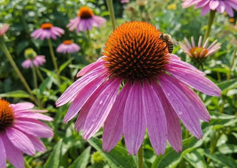 Nors tai klasikinis augalas, natūralistiniame gėlyne jis atlieka kritinę funkciją - tai yra „maitinimo stotis“ bitėms ir struktūrinis elementas žiemai. Mičigano valstijos universiteto (MSU) atlikti tyrimai su vietiniais augalais rodo, kad ežiuolės yra vieni geriausių augalų biologinei įvairovei palaikyti, pritraukiantys dešimtis rūšių laukinių bičių ir drugių vasaros metu. Svarbiausia taisyklė auginant jas šiame stiliuje - nukirpti žiedus ne rudenį, o tik pavasarį. Juodi, dygliuoti sėklų burbuolės („ežiukai“) žiemą atrodo skulptūriškai sniego kepurėse ir tarnauja kaip maistas paukščiams (dagiliams). Rinkitės paprastas, nepilnavidures veisles, nes jos yra ilgaamžiškesnės už modernius hibridus. Apie šio augalo priežiūra rasite: Rausvažiedė ežiuolė (Echinacea purpurea)